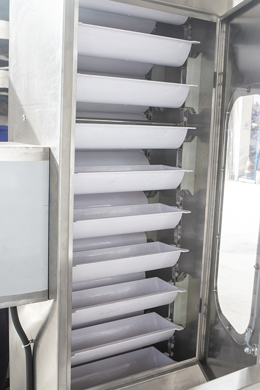結構、工作原理及使用特點:本機由烘箱、振動底座、自動上料機構、抽濕裝置、冷卻裝置、連接風管、蒸汽換熱器、風機等組成。當蒸汽進入換熱器后進行熱交換,產生高溫干燥熱空氣通過強力風機的作用,由下而上進入烘箱,同時物料在自動吸料機構的作業下自頂部進入烘箱,熱空氣與物料在烘箱內進行逆流交換,物料在振動電機的作用下沿阿基米德螺旋線翻滾走動,并與熱風充分接觸,從而達到干燥效果。烘箱上部連接吸濕裝置,及時排除烘焙時產生的濕氣。烘箱內裝有網板,以滿足不同大小的物料烘干要求。全自動振動烘干設備最大特點是能源能充分利用、工作連續性好、物料干燥均勻、生產量大、操作方便、衛生條件好、易清洗、易維護、適用范圍廣。整機均由全不銹鋼制作,符合GMP要求。本機適用于烘干帶濕潤水的物料,不適合烘干含有結合水的物料。